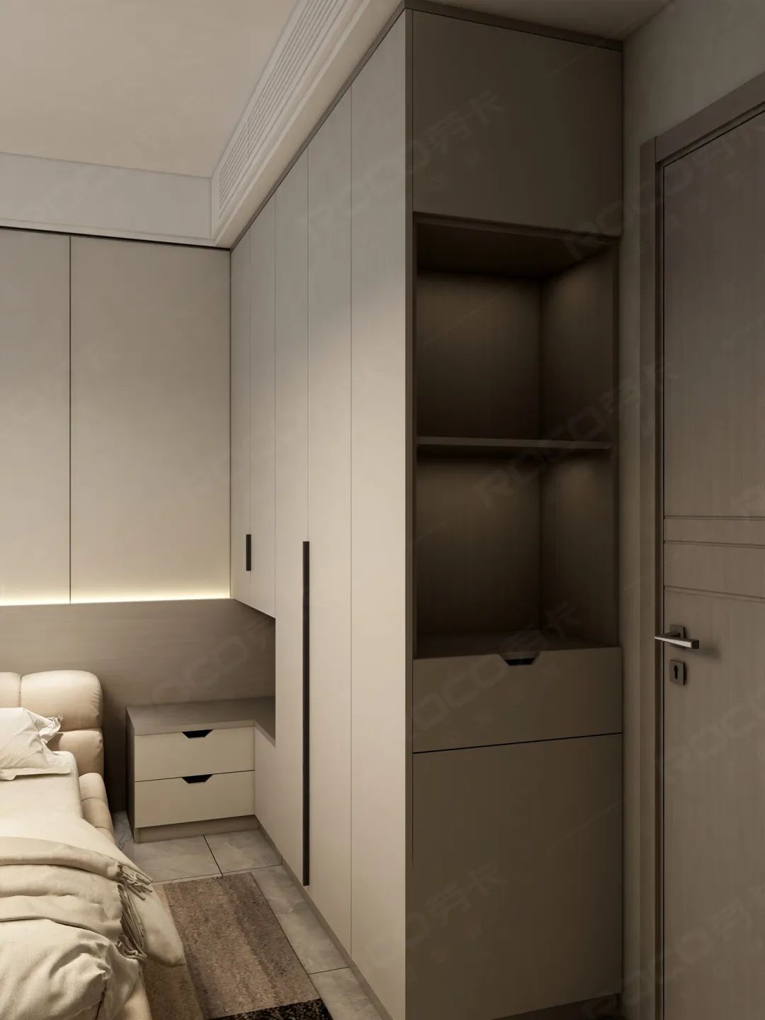 定制整墙衣柜收纳四季衣物,侧面做了开放格进门物品随手摆放,日常生活更便利。转角延伸床头柜,搭配高颜值护墙板+暖光灯带,美观与实用兼备。