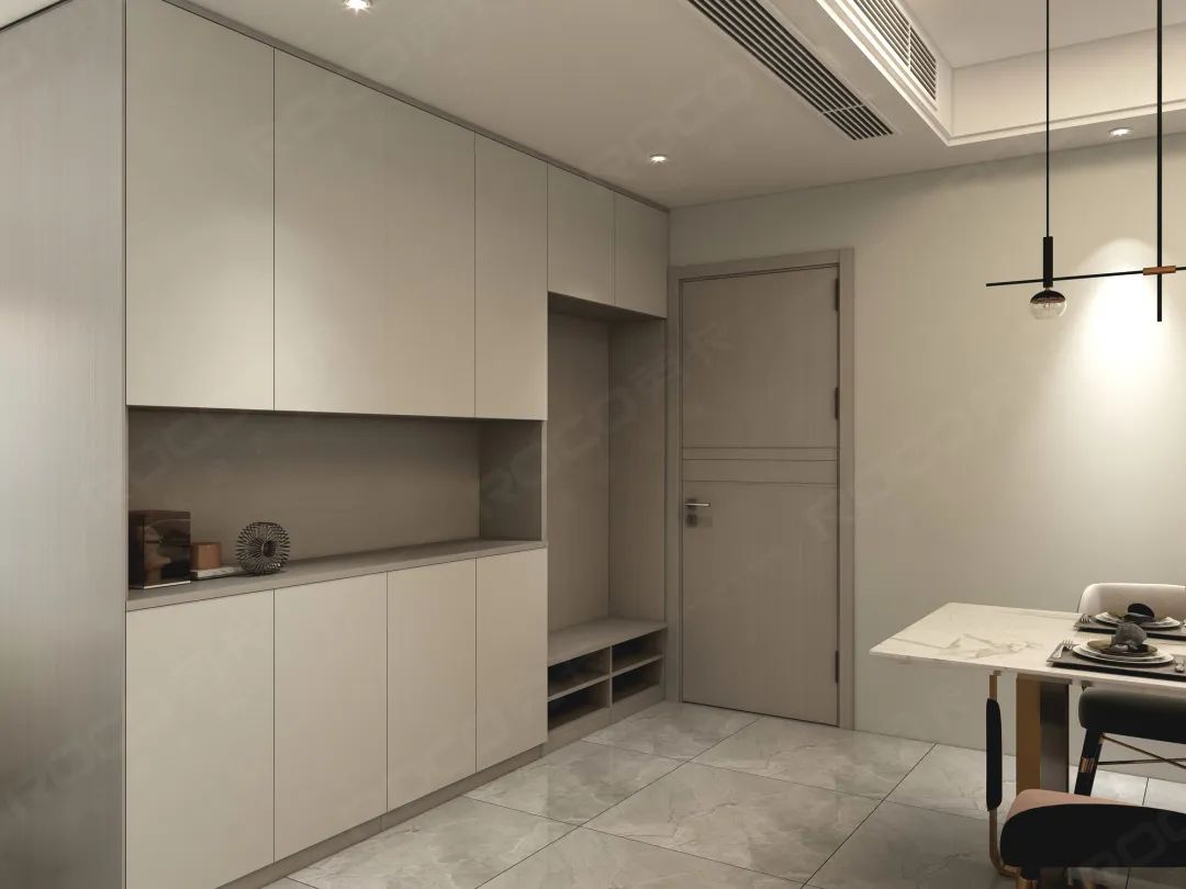 进门处为餐厅空间,定制储物柜,进门随手可挂上衣物,兼具功能与美感,中部留空既能随手放置小物,可放置一些小家电,二者集于一体,充分利用空间。