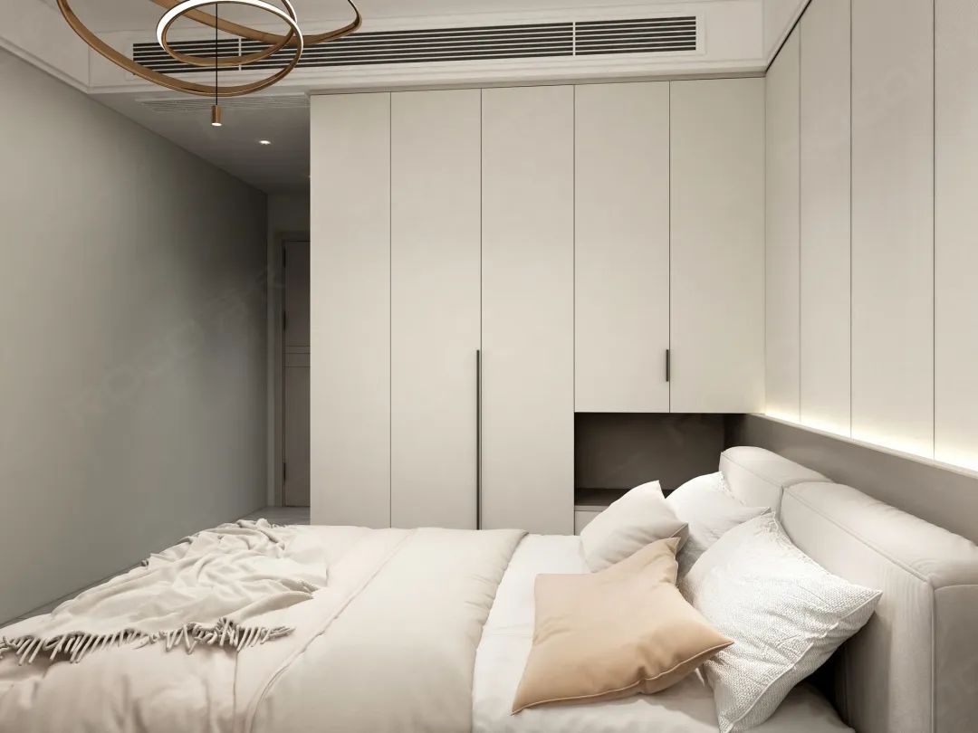 主卧布局简约,色调宁静雅致,米亚布纹护墙板,自然温馨,带来舒缓的睡眠氛围。