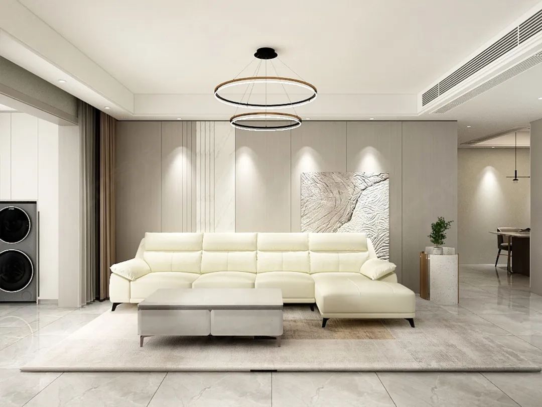 高颜值格栅+平板搭配的护墙板打造的电视墙丰富了视觉感受,层次感十足。配套岩板茶几+米黄色真皮沙发,为客厅带来丰富储物容量同时更增添高级。